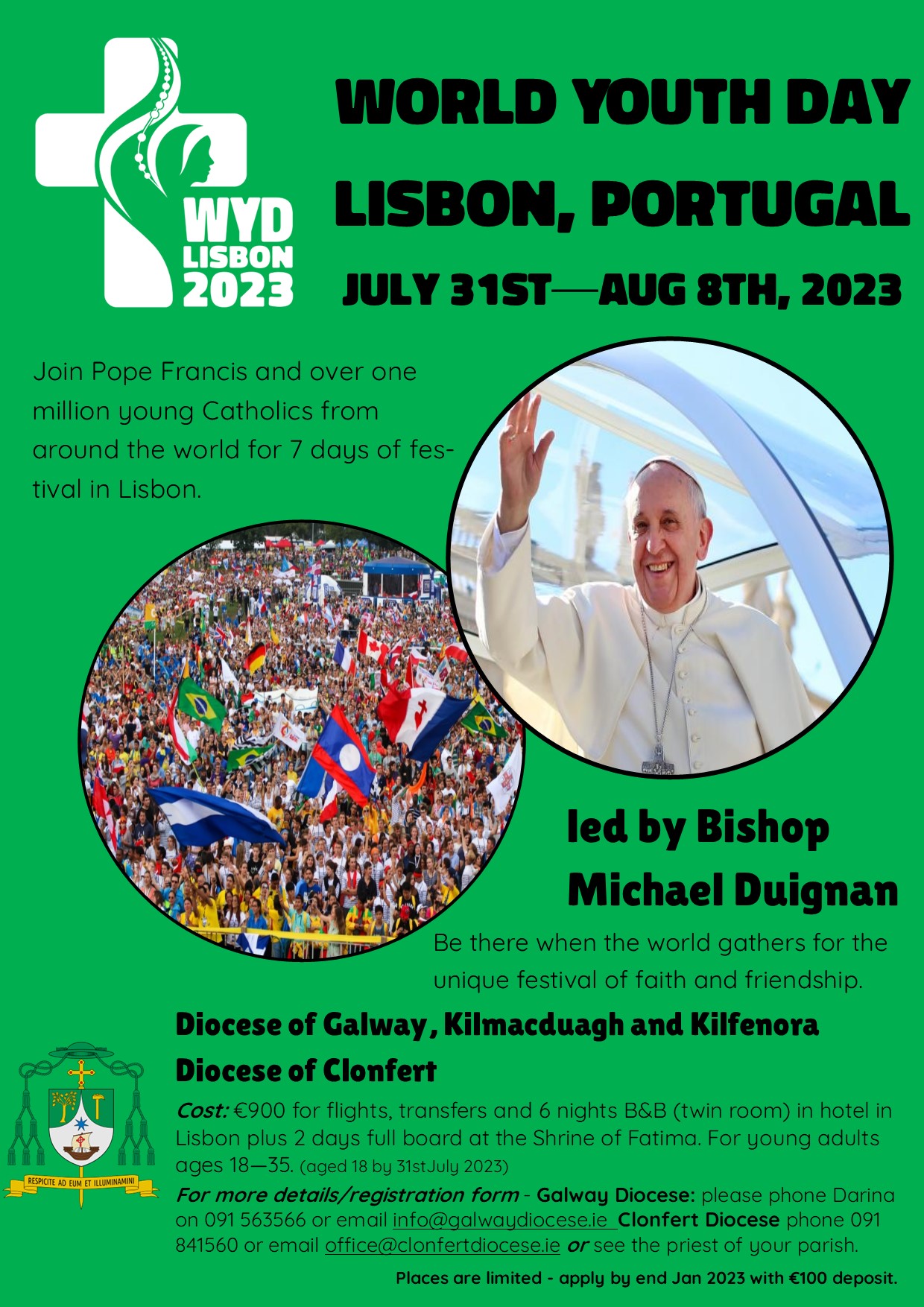 WORLD YOUTH DAY GATHERING WITH POPE FRANCIS 2023 in LISBON and FATIMA from July 31st – August 8th, 2023.Spiritual Director – Bishop Michael Duignan. OPEN TO ADULTS BETWEEN THE AGES OF 18 (by 31st July 2023) AND 35. Subsidised Fare €900. For further information and booking form contact Isabelle at the Clonfert Diocesan Office – Tel. 91 841560 Email. office@staging.clonfertgalway.actondev9.com or your local priest. Limited places available. Bookings close 31st January 2023. Be there when the world gathers for the unique festival of faith and friendship!
